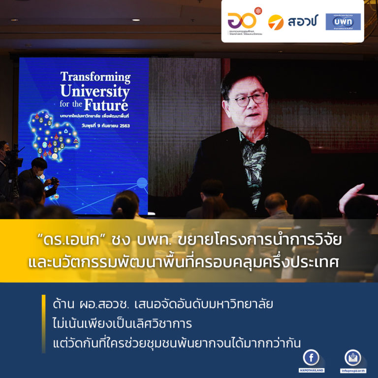 ข่าวประชาสัมพันธ์ “ดร.เอนก” ชง บพท. ขยายโครงการนำการวิจัยและนวัตกรรมพัฒนาพื้นที่ครอบคลุมครึ่งประเทศ เชื่อเศรษฐกิจท้องถิ่นช่วยเศรษฐกิจระดับชาติได้ ด้าน ผอ.สอวช. เสนอจัดอันดับมหาวิทยาลัยไม่เน้นเพียงเป็นเลิศวิชาการแต่วัดกันที่ใครช่วยชุมชนพ้นยากจนได้มากกว่ากัน