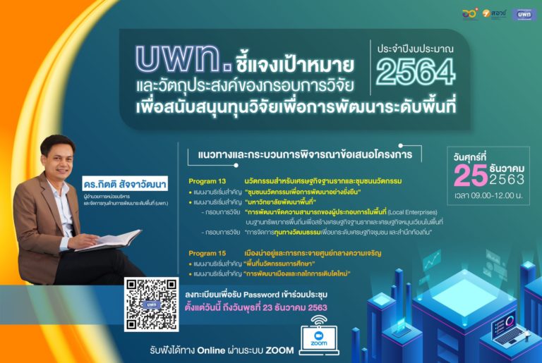 ข่าวประชาสัมพันธ์ ขอเชิญเข้าร่วมรับฟัง “การชี้แจงเป้าหมาย และวัตถุประสงค์ของกรอบการวิจัย เพื่อสนับสนุนทุนวิจัยเพื่อการพัฒนาระดับพื้นที่ ประจำปีงบประมาณ 2564”