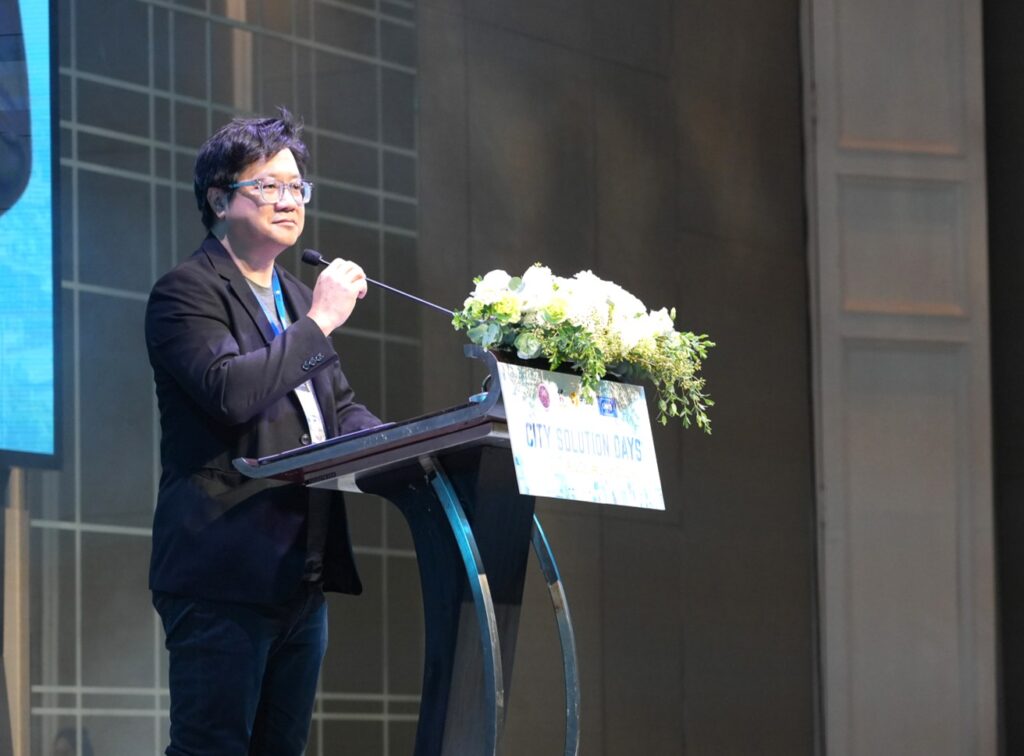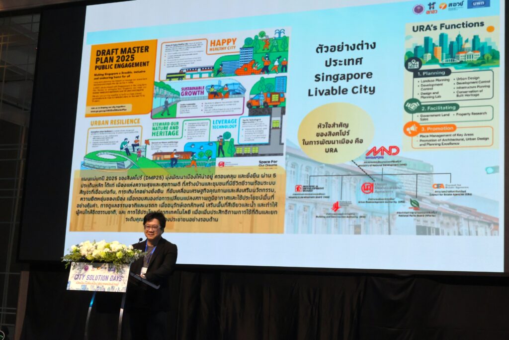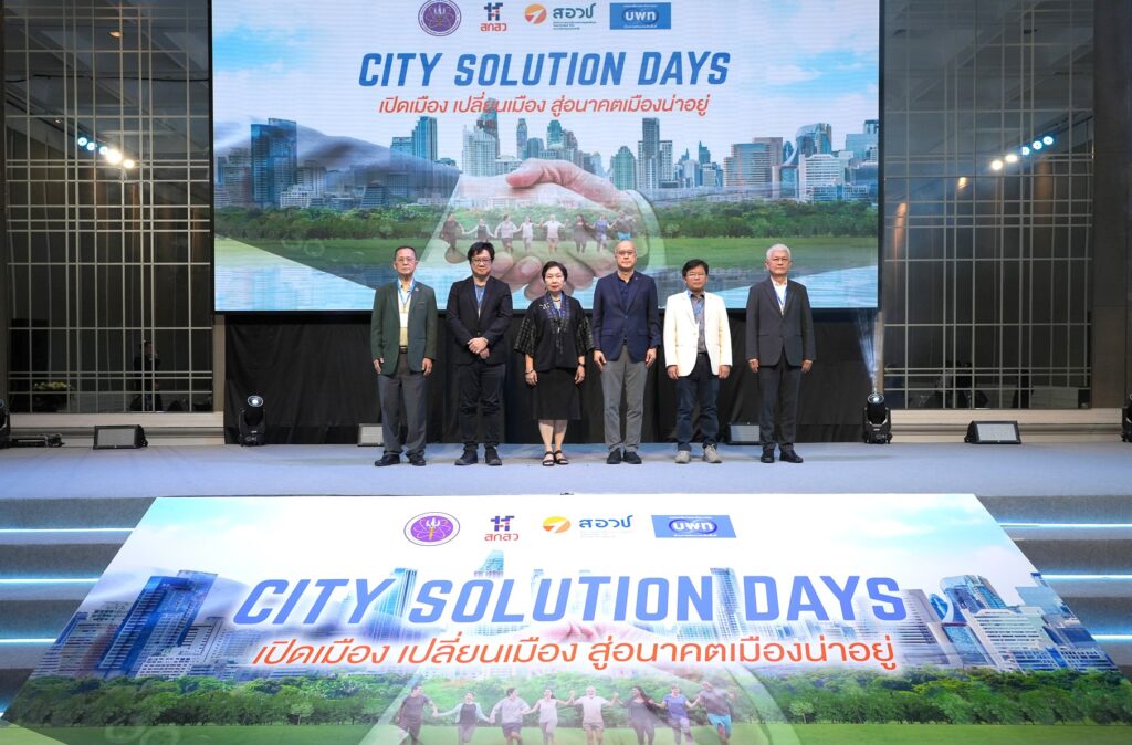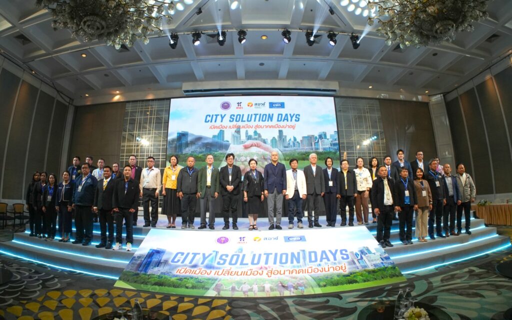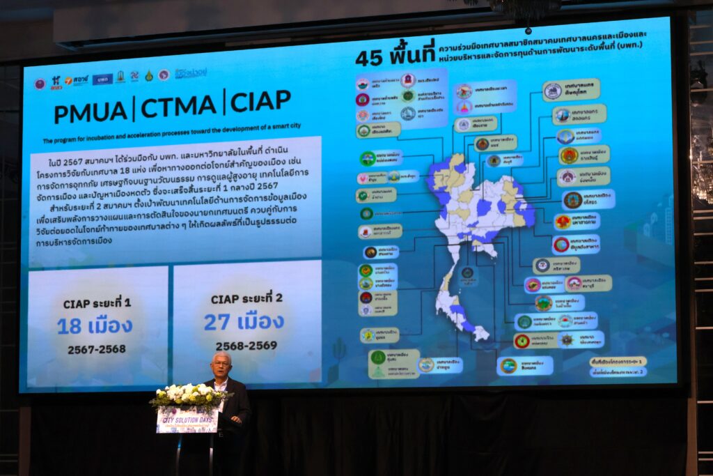 ในเวที City Solution Days ได้รับเกียรติจากนายบรรจง โฆษิตจิรนันท์ นายกเทศมนตรีเมืองร้อยเอ็ด และนายกสมาคมเทศบาลนครและเมือง ขึ้นกล่าวปาฐกถาพิเศษในหัวข้อเรื่อง “สถาบันพัฒนาเมือง โจทย์ใหม่ของเมืองกับการขับเคลื่อนเชิงพื้นที่และทิศทางการเปลี่ยนแปลง” นายบรรจง กล่าวว่า สมาคมเทศบาลนครและเมือง ทำงานร่วมกับหน่วย บพท. และมหาวิทยาลัยในพื้นที่ โดยมีจุดมุ่งหมายสำคัญเพื่อสร้างต้นแบบเมืองที่สามารถยกระดับสู่ความเป็น “เมืองน่าอยู่อย่างชาญฉลาด” ด้วยกรอบการขับเคลื่อนผ่านโปรแกรมCIAP (City Incubation & Acceleration Program) หรือ “โปรแกรมบ่มเพาะและเร่งรัดเมืองน่าอยู่” โดยมีกลไกสำคัญ ประการแรก คือ Incubation – การบ่มเพาะเมือง เพื่อค้นหาศักยภาพและโจทย์สำคัญของแต่ละเมือง และประการที่สอง Acceleration – การเร่งรัดการเปลี่ยนแปลง นำไปสู่ต้นแบบที่ชัดเจน วัดผลได้ สามารถขยายผลต่อยอดได้จริง และในปัจจุบันมีผลลัพธ์เกิดขึ้นหลายพื้นที่ เช่น ร้อยเอ็ด กลายเป็นเมืองเศรษฐกิจ, ทุ่งสง กลายเป็นเมืองที่สามารถรับมือภัยพิบัติได้อย่างเข้มแข็ง และนนทบุรี กลายเป็นเมืองแห่งสุขภาวะที่ดูแลคุณภาพชีวิตประชาชนอย่างรอบด้าน นอกจากนี้ยังมีเมืองอีกกว่า 18 เมือง ที่ได้ผ่านการพัฒนาในระยะที่ 1 ของ CIAP โดยก้าวที่สำคัญในปีนี้คือ การจัดตั้ง “สถาบันพัฒนาเมือง” ภายใต้สมาคมนครและเมือง ทำให้เป็นพื้นที่กลางเปรียบเสมือน “พื้นที่องค์ความรู้เปิดของระบบนิเวศเมือง” เพื่อสนับสนุนและหนุนเสริมการทำงานของเมืองทั่วประเทศ ทำหน้าที่เชื่อมโยงงานวิจัย ความรู้ และนวัตกรรม ให้ขยายผลและต่อยอดนำไปสู่การปฏิบัติได้จริงต่อการดำเนินชีวิตของประชาชน และสร้างความร่วมมือไปยังทุกพื้นที่เป้าหมายเพื่อให้ทุกเมืองของไทยก้าวสู่ความเป็น “เมืองน่าอยู่อย่างชาญฉลาด” ตอบสนองทั้งคุณภาพชีวิต เศรษฐกิจ และความยั่งยืนทางสิ่งแวดล้อม โดยมีสมาคมเทศบาลนครและเมืองและสถาบันพัฒนาเมืองเป็นกลไกกลางในการประสานงาน สนับสนุน เชื่อมโยงทุกฝ่าย ที่มุ่งหวังอย่างยิ่งว่าในอนาคตเมืองไทยจะสามารถก้าวสู่ความเป็น “เมืองน่าอยู่สำหรับคนรุ่นเราและรุ่นต่อไป” ได้อย่างยั่งยืนแท้จริง นอกจากนี้