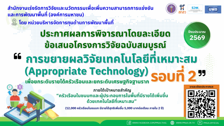 ประกาศการพิจารณาข้อเสนอโครงการวิจัยโดยละเอียด รอบที่ 2 กรอบการวิจัย การขยายผลวิจัยเทคโนโลยีที่เหมาะสม (Appropriate Technology) เพื่อยกระดับรายได้ครัวเรือนและยกระดับเศรษฐกิจฐานราก ประจำปีงบประมาณ 256930 March 202630 March 2026
